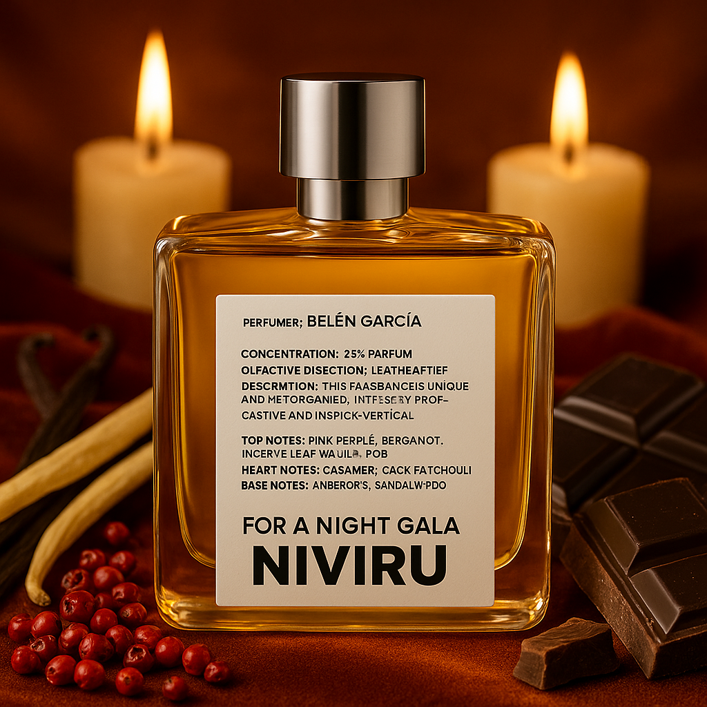 For a Night Gala de NIVIRU es una fragancia de la familia olfativa Oriental Especiada para Hombres y Mujeres. Esta fragrancia es nueva. For a Night Gala se lanzó en 2024. La Nariz detrás de esta fragrancia es Belén García. Las Notas de Salida son tabaco, incienso, pimienta rosa y bergamota; las Notas de Corazón son vainilla, haba tonka, cacao, cachemira y pachulí; las Notas de Fondo son ámbar gris y sándalo.